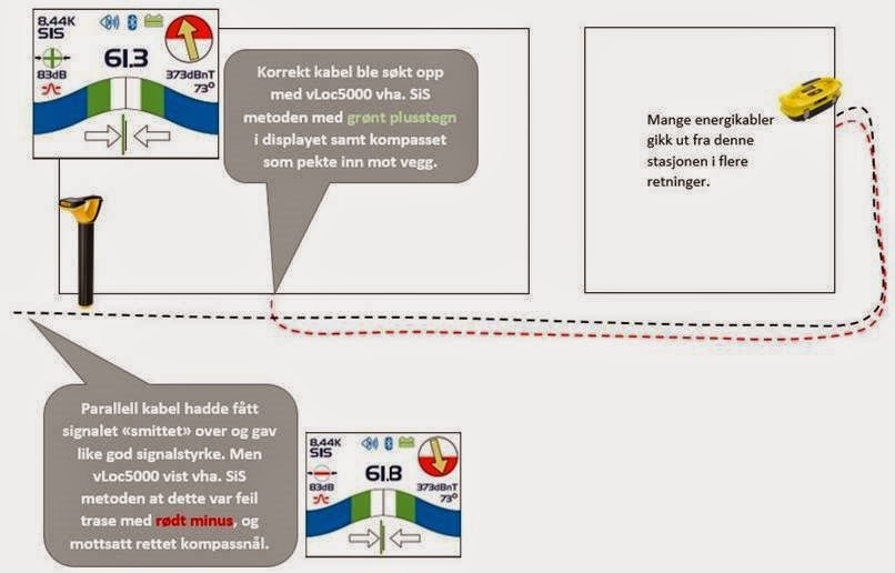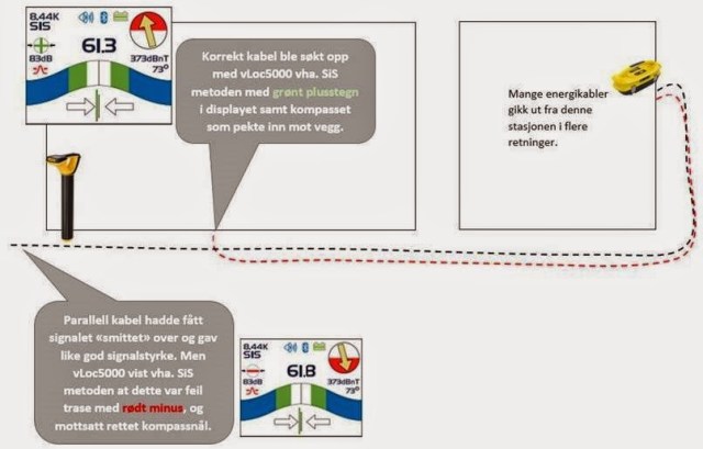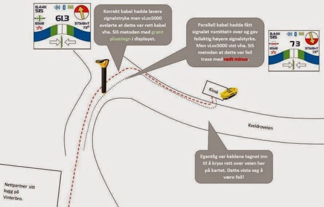 Som det går frem av figuren var dette et tilfelle hvor vanlige kabelsøkere ville ha påvist feil trase fordi feil kabel gav høyere felt/signalstyrke enn den kabel vi hadde clampen rundt. Dermed ville man blitt lurt uten SiS metoden som gav grønt pluss på rett kabel samt kompass pil pekende korrekt mot kabelens fjernende.