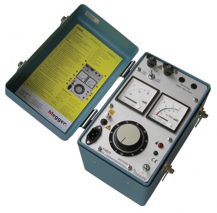Nevnte viktige jordingstest er enkelt utført med Megger testutstyr, modell YMER, som er bygget og beregnet for denne kontrollen av jordfeilstrømmens returkrets i ledningsnettet. YMER er utstyrt med en strømkilde som er valgbar og kan gi 0-25V 20A eller 0-50V 10A. Videre er det en tilkobling for strømtang. YMER er utstyrt med to analoge målere, ett for spenning og en kombinert amperemeter og relativ ly / Im (se figur ovenfor).