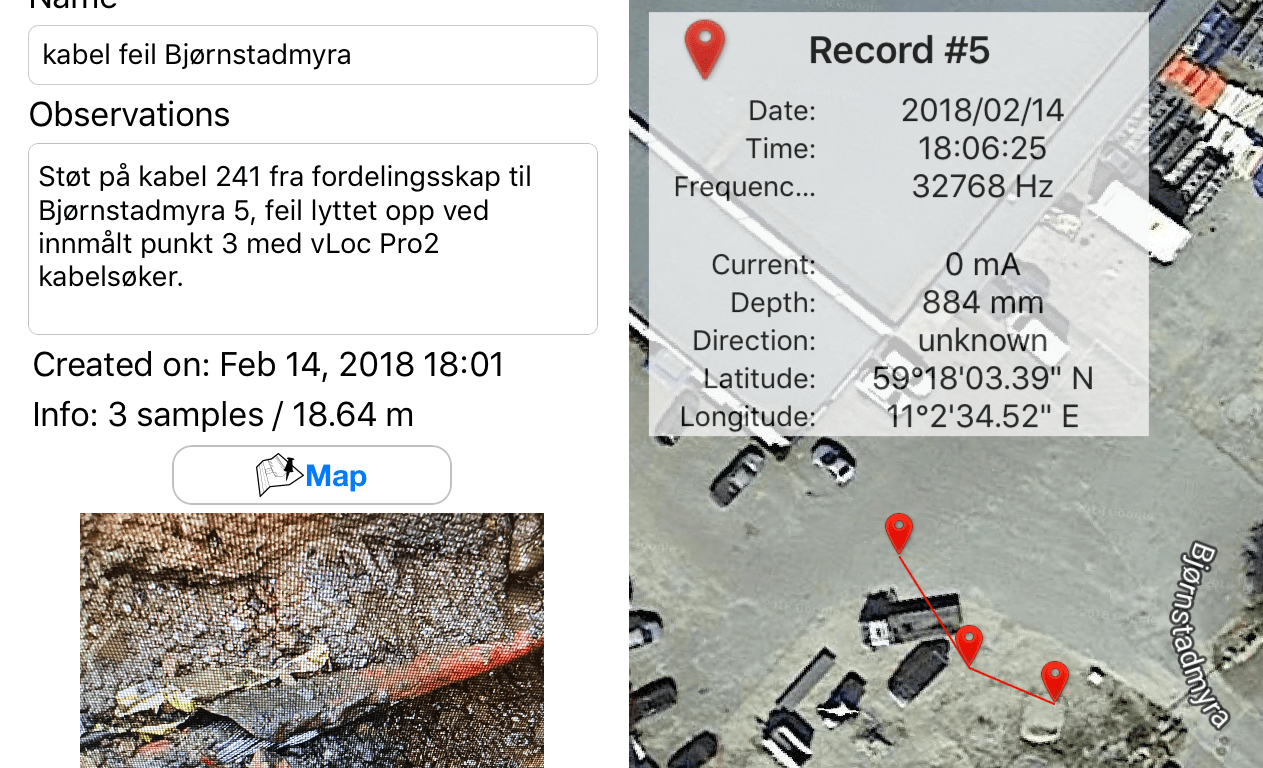 VMMAP installeres på din smarttelefon som pares via bluetooth med en vLoc Pro2 eller vLoc 5000 kabelsøker. Alle data som kabelsøkeren registrerer på utvalgte punkter du vil ha logget blir lagret, som dybde, feltstyrke, strømstyrke, frekvens benyttet, dato og tid.