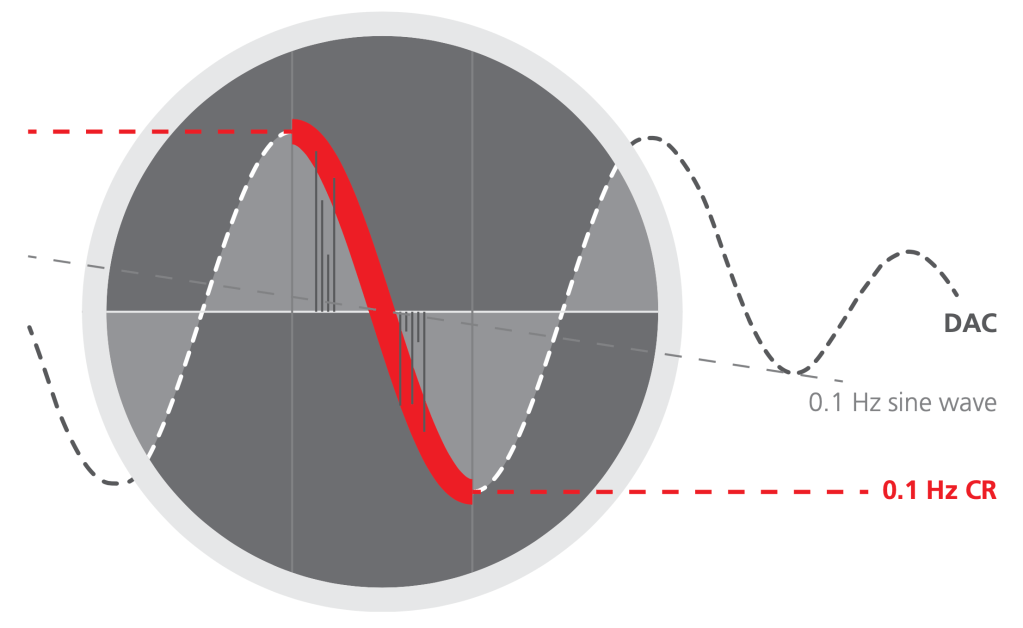 Figuren over viser et typisk eksempel på hvordan PD-måling blir utført i polaritetsskiftet/ skråningen av den påførte test spenning. Brattheten til VLF CR- og DAC-skråningene i forhold til sinusbølgen på 0,1 Hz kan sees tydelig. Derfor kan ikke sinus 0,1Hz test spenningen direkte sammenlignes med 50Hz nettdrift frekvens, og PD fenomener som skjer under vanlig drift i nettet blir derfor ikke alltid påvist pålitelig med 0,1Hz sinus.