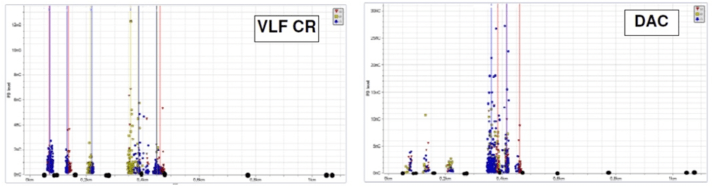 VLF cosine-rectangular test spenning (VLF CR) og DAC test spenning (damped alternating voltage) fungerer begge i samsvar med prinsippet om 50 Hz Slope Technology. Dette er spesielt viktig for PD-diagnose, siden pålitelig evaluering av resultatene krever en direkte sammenlignbarhet med 50Hz nettfrekvens. Det er allment kjent at PD fenomener endres ved ulike frekvenser, noe som gjør pålitelig evaluering vanskelig. Megger sin 50 Hz Slope og DAC teknologi er direkte sammenlignbar med 50Hz nettdrift og finner prosentvis langt flere PD fenomener enn hva VLF sinus kurveformen gjør.