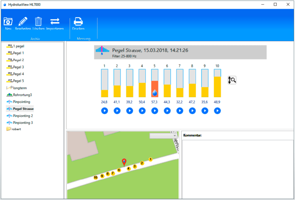 Lekkasjelytting ute i bygater om andre områder med mye omgivelsesstøy kan være utfordrende da det kan være vanskelig å høre eksakt hvor den høyeste lekkasjelyden er. Med opptaksfunksjonen innebygget i HL 7000 marklytteren kan man fra kontoret, under rolige omgivelser, på nytt lytte til de innspilte lekkasjelyder og lettere identifisere riktig lekkasjepunkt. PC programmet viser i kartet hvor de ulike lyttepunktene ble utført og identifisere høyeste utslag som lekkasjepunktet, se skjermbilde nedenfor.