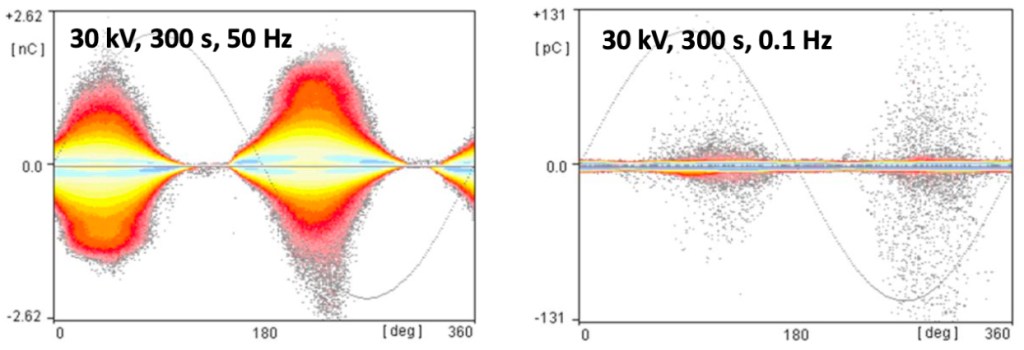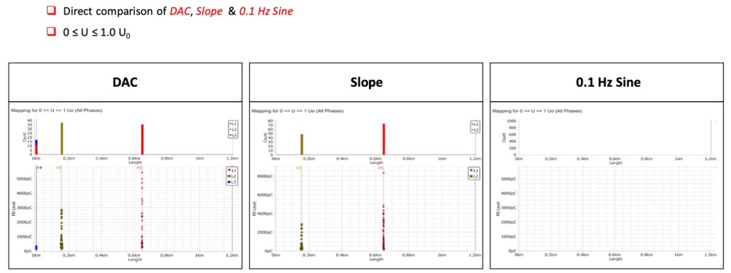PD testing med sinus kan ikke helt sammenlignes med 50Hz da polaritetsskiftet er omkring 500/600 ganger tregere enn ved 50Hz og 0,1Hz CR. Dette gjør at ionisering og utladnings mekanismer inne i en defekt (isolasjonssvakhet) ikke er de samme som ved nettdrift når sinustesting utføres. VLF sinus systemer er ofte rimeligere sammenlignet med VLF CR og DAC systemer men vil ikke detektere like mye PD problemer. Se sammenligning av alle 3 kurveformer ved PD testing utført på samme kabel nedenfor: