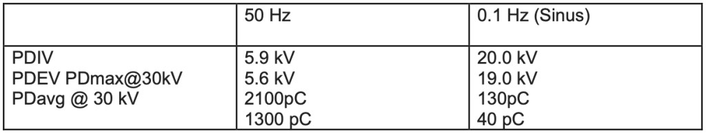 PD fenomener (glimming) i energikabler kan avsløres og lokaliseres med VLF testspenning 0,1Hz som kilde men studier fra Tyskland viser at sinus baserte VLF systemer ikke like effektivt avslører PD der det normalt vil inntreffe ved 50Hz nettdrift. Se tabell nedenfor: