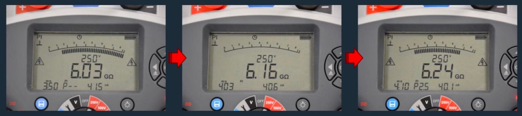 - PI-testing innebærer å beregne forholdet mellom isolasjonsmotstand ved de to måleintervallene. Dette gir informasjon om trenden for isolasjonsmotstand over tid. Evnen til å observere hvordan isolasjonsmotstanden endres over en varighet er verdifull for å oppdage problemer som kanskje ikke er tydelige i en enkel IR test. Typisk kan en kort IR test vise gode høye resistanseverdier på et testobjekt der isolasjonen har begynt å forringes men en PI test vil kunne avsløre dette.