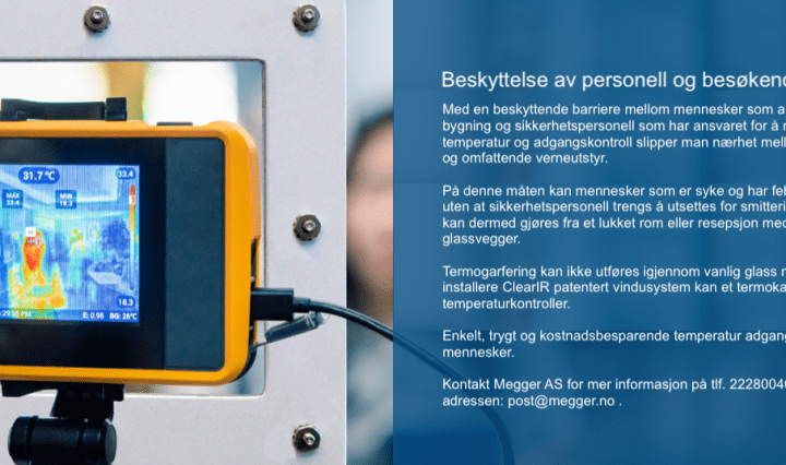 Beskyttelse av personell og besøkende ClearIR Viewing System gir en beskyttende barriere mellom mennesker og muliggjør termografering og identifikasjon av syke mennesker uten smitterisiko for operatør eller sikkerhetspersonell. Med en beskyttende barriere mellom mennesker som ankommer en bygning og sikkerhetspersonell som … Fortsett å les Clear IR Viewing System – termografering