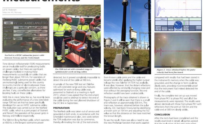 Record in long range TDR-measurements on submarine power cables Time domain reflectometer (TDR) measurements are an invaluable tool for pre-locating faults on power cables, but there are significant challenges involved in making these measurements successfully on cables that are longer … Fortsett å les Seba nor med rekordmåling for Statnett – English news letter …